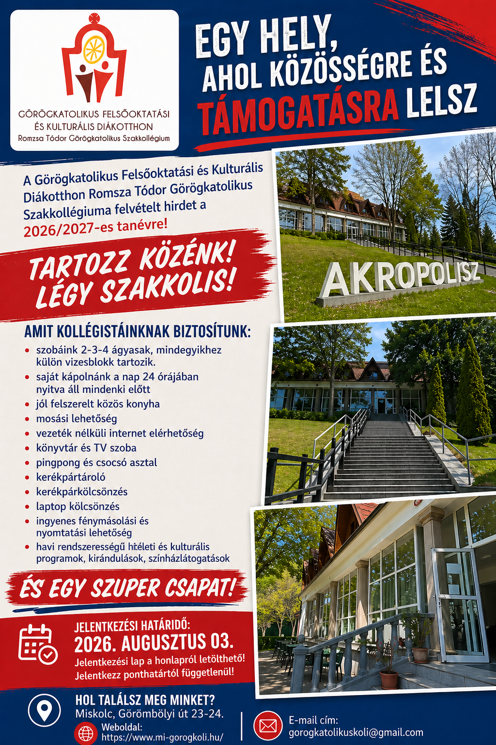 Örömmel értesítünk, hogy a Miskolci Görögkatolikus Felsőoktatási és Kulturális Diákotthon felvételt hirdet a 2025/2026 tanévre felsőoktatási intézmény nappali tagozatos hallgatói számára.